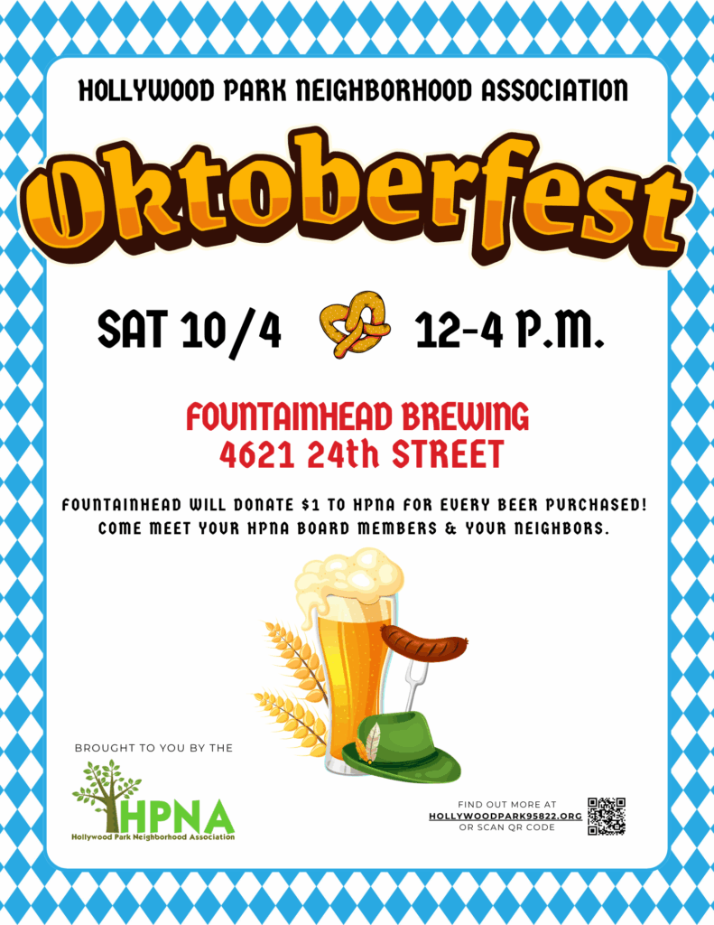 October 4 is HPNA’s first annual OktoberFest from 12-4 at Fountainhead Brewing (4621 24th Street). After working your garage sale (or walking to other sales!), come relax and grab a pint of Hollywood Park’s very own brewery!