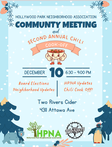 We are looking forward to the annual HPNA Community Meeting coming up on Wednesday, December 10, from 6:30 – 9 p.m. at Two Rivers Cider Company (4311 Attawa Avenue). As always, we will get HPNA updates from your HPNA President and Treasurer; City updates from City Councilmember Caity Maple; and dues-paying HPNA members get the opportunity to vote on new HPNA bylaws and HPNA Board elections.