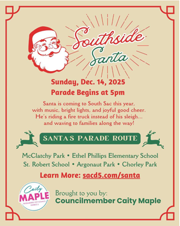 We are so happy to be on Councilmember Caity Maple’s Southside Santa Parade route this year, with Santa himself stopping by St. Robert School (2251 Irvin Way) between approximately 6:15 – 6:40 p.m. before the parade continues on its route. Your HPNA Board members will be there handing out hot chocolate and candy canes for the little ones, as well as photos with Santa as time allows. We hope to see you and your family out there; please join us!